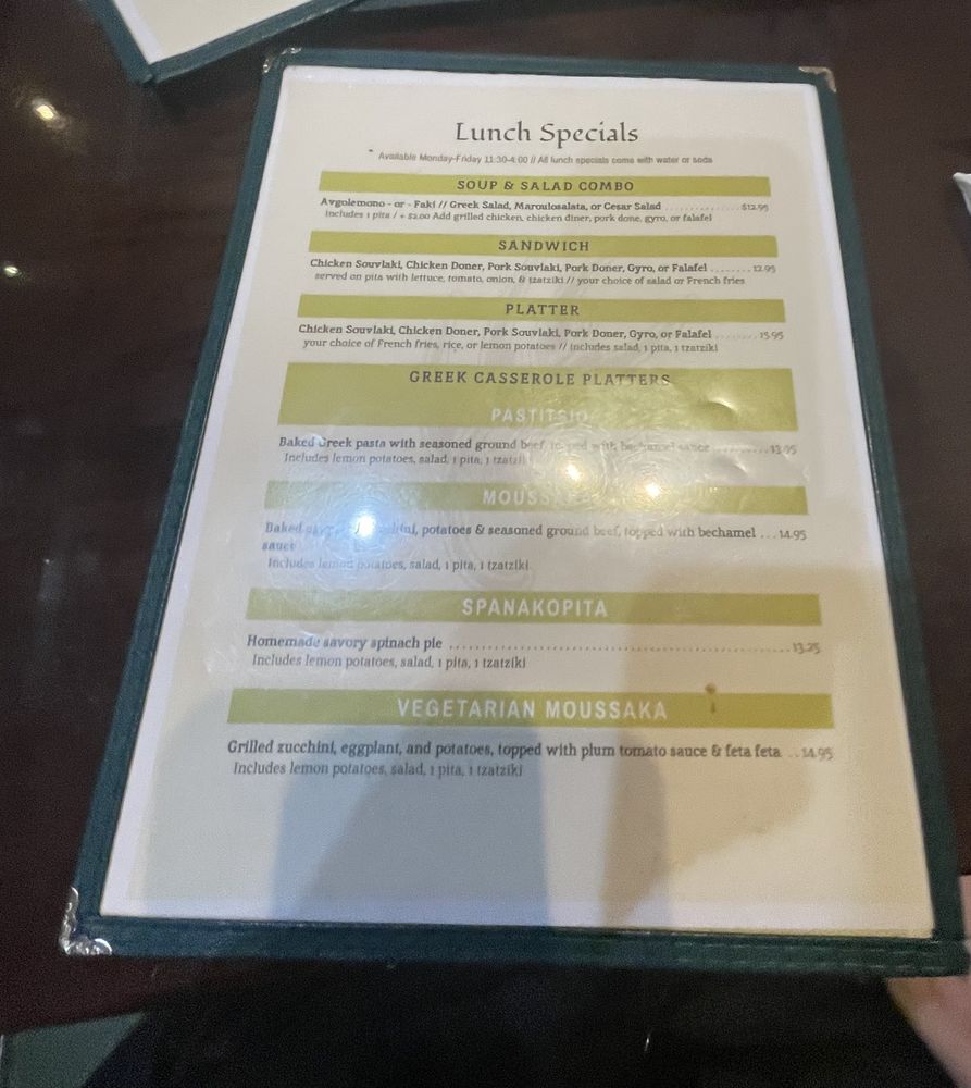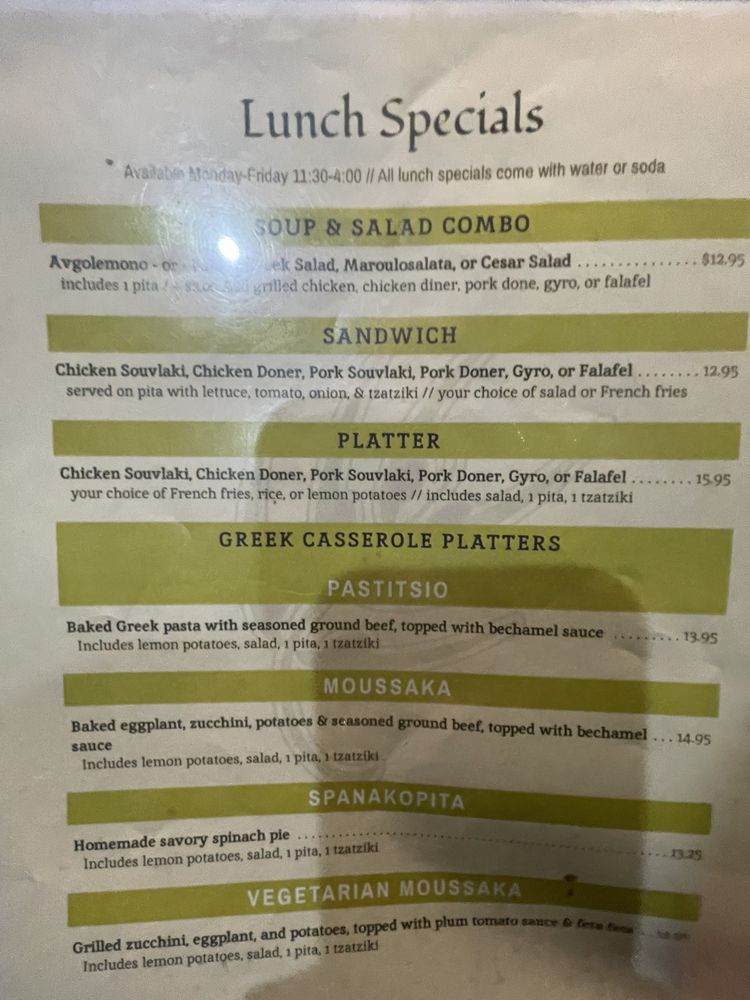 homemade savory spinach pieserved with lemon potatoes, choice of soup or salad, 1 pita, & 1 tzatziki