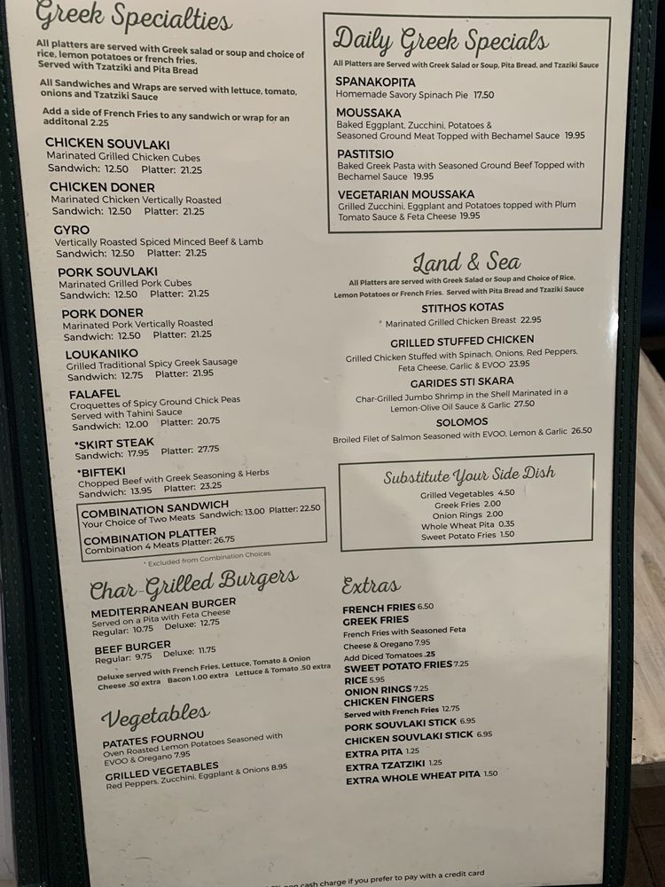 layered grilled zucchini, eggplant, potatoes, topped with plum tomato sauce & feta cheeseserved with lemon potatoes, choice of soup or salad, 1 pita, & 1 tzatziki